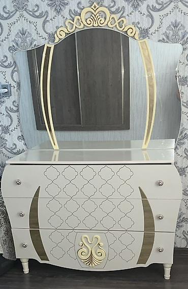 - Komod + güzgü: 3 geniş çekmece, qızılı və naxışlı ön panel, üstündə iri dekorativ güzgü (qızılı çərçivə və tacvari element).