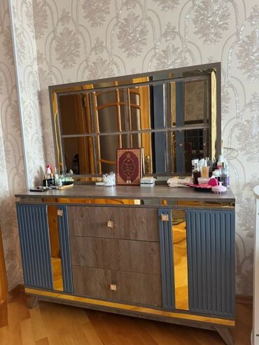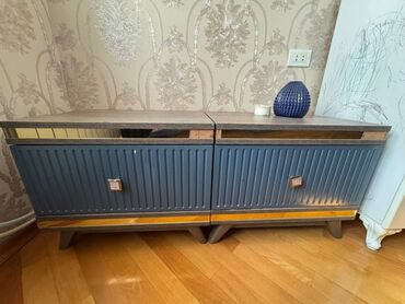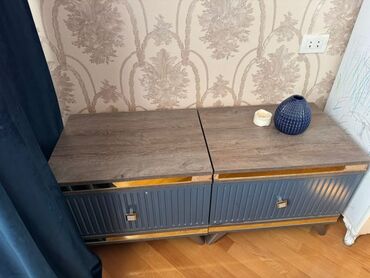 - 2 ədəd tumbə: üst səthi ağac teksturalı, korpus tünd göy rəngdə, ön paneldə şaquli relyefli dizayn, qızılı dekor zolaqları və kvadrat formalı tutacaqlar. Hər biri qapalı bölməlidir.
