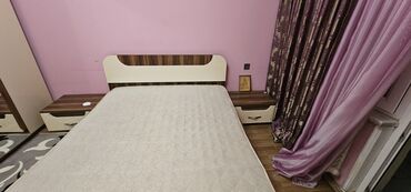 Yataq otağı mebel dəsti - 2 nəfərlik taxta çarpayı: taxta karkas, ortopedik matras, taxta başlıqda yumşaq ağ döşəmə hissəsi, taxta ayaqlıq. - 2 ədəd tumba: üstündə şüşə səth, ön hissəsi radiusl...