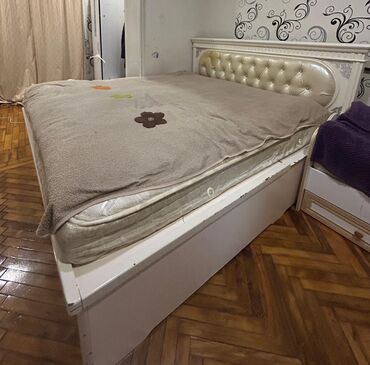 Yataq otağı dəsti,yenidir istifade olunmuyub,kocuruk deye satilir - Çarpayı: geniş ölçülü, yumşaq bozumtul məxmər başlıqla. Başlıq paneli dekorativ bölmələrə malikdir, divara söykənən baza ilə. M...