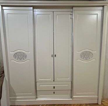 Ağ rəngdə tam yataq otağı dəsti - Dörd qapılı paltar şkafı: Ortada iki ədəd tam boy güzgü qapısı, daxildə işıqlandırma görünür. Şaquli relyef panellər və qara tutacaqlar. - Çekmecəli komod: 4 geni...