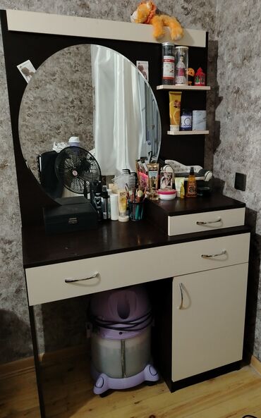 - Tualet masasının komplekti – böyük dairəvi güzgü, yan rəfli üst hissə (bir neçə açıq rəf), masa üstü, 2 siyirmə və 1 qapılı şkaf bölməsi. Alt hissədə boş yer əlavə avadanlıq/saxlama üçün uyğundur.