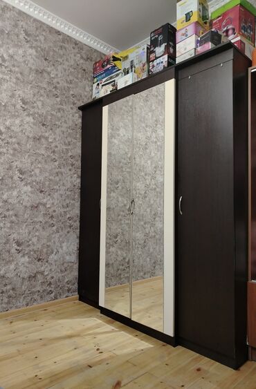 - Geniş qarderob şkafı – 4 qapılı konstruksiya, orta hissədə böyük güzgülər, içəridə asılqan bölməsi, rəflər və üst hissədə əlavə saxlama sahəsi. Qapı tutacaqları metal.