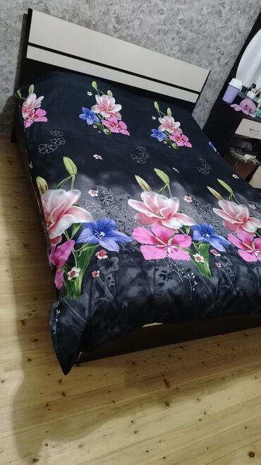 - Yataq dəstindəki tekstil: qara fonlu, çiçək naxışlı örtük (şəkillərdə görünür).