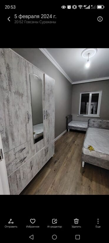 Yataq otağı dəsti – 680 AZN Komplekt: - Dolab: 200×160×47 (güzgülü sürgülü qapılar, bölmələr və asılqan hissə) - Taxt: 200×160 - Termo şkaf/vitrin: 80×180×40 - Tumba: 45×40 - Puf/komod hissəsi güz...