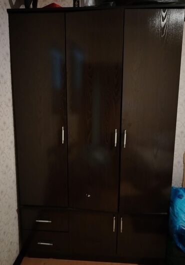 - 2) Tünd qəhvəyi, 3 qapılı model. Aşağı hissədə çekmecələr və əlavə bölmələr var. Düz səthli qapılar və metal tutacaqlar.