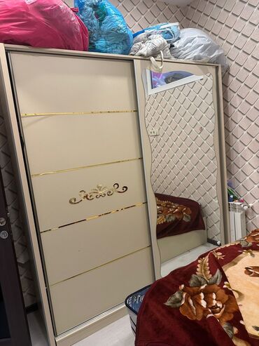 1) Dolab: sürgülü qapılar, bir qapıda tam ölçülü dalğalı konturlu güzgü. Ön paneldə qızılı dekor zolaqlar və ornament.