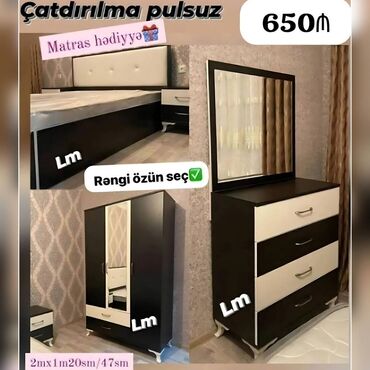 Yataq otagi dəsti Sifarişlə və yeni Qiymət : 649₼ Dəstə daxildir: Dolab : 2x1.20×47 Termo✔️ Taxt :1.60×2 +matras hediyye🎁 Tumbalar✔️ Rəng seçimi sərbəst🆘 Çatdırılma şəhər daxili ...