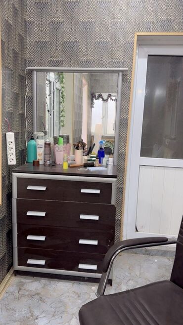 - Güzgülü komod/çiynlik masası (üst güzgü çərçivəli, 4 geniş çəkməce, ağ-sürməyi tutacaqlar)
