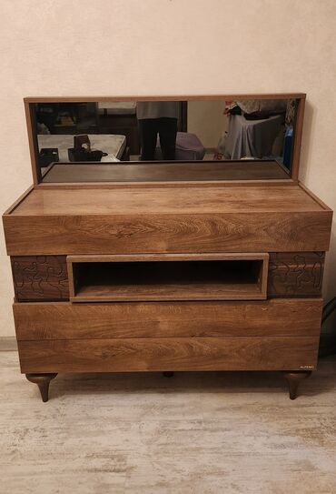 - Komod-güzgü: ALFEMO brendi. Təbii ağac teksturasında korpus, yuxarı hissədə iri üfüqi güzgü. Orta bölmədə açıq rəf, altda geniş çekmece/qutular. Konik ayaqlar sayəsində stabil və estetik görünüş.