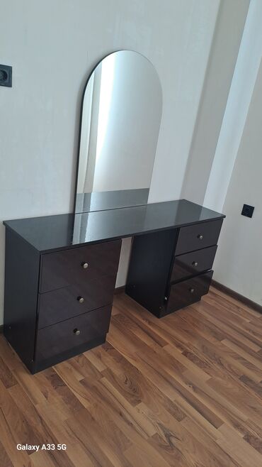 - Tualet masası/kozmetika masası – yanlarda 3+3 çekmeceli bölmə, üstü parlaq səth, böyük yarımdairəvi güzgü.