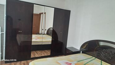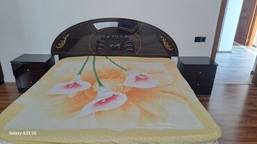 - Geniş iki nəfərlik çarpayı – dekorativ başlıq, yuxarı hissədə naxış və güzgü detalı.