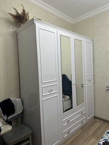 - Dolab: Ağ rəngdə 4 qapılı model. Ortada 2 böyük güzgülü qapı, kənarlarda şaquli panellər. Alt hissədə 2 geniş çekmece, kənarlarda əlavə kiçik çekmecələr və saxlama bölmələri. Dekorativ tutacaqlar və klassik profilli üst tağ.
