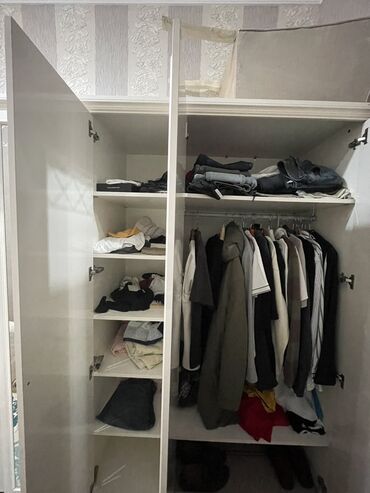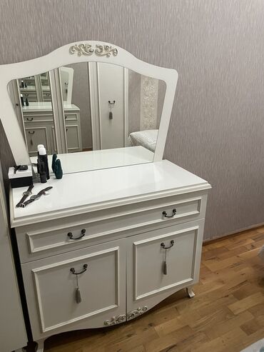 (Qiymət razılaşma yolu ilə)Mebel dəsti – qarderob, güzgülü şkaf, divar rəfləri və masa - Material: ağac teksturalı laminat (açıq qoz rəngi), metal tutacaqlar. - Qarderob: çoxbölməli konstruksiya, ...