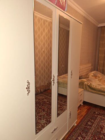 - Şkaf: üç qapılı dolab, orta və sağ qapıda böyük güzgülər, alt hissədə iki çekmece. Dekorativ naxışlı tutacaqlar.