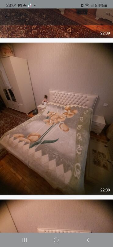 - Yataq: yumşaq dərimsi başlıq, kapitone düyməli dekor. Korpus ağ rəngdə, dekorativ ağ ayaqlar.