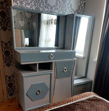 - Tualet masa-güzgü bloku: geniş üst səth, bir iri çekmece, əlavə iki kiçik çekmece və yan dolab; iri üfüqi güzgü və sağ tərəfdə ayrıca dik güzgü paneli; açıq niş bölmələri