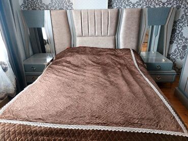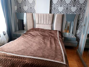- Geniş çarpayı: hündür, yumşaq süngərli başlıq; başlığın hər iki tərəfində şaquli güzgü panelləri və komod tipli tumbalar
