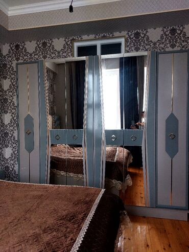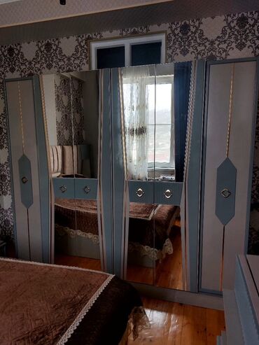 - 4 qapılı böyük şkaf: mərkəzdə iki ədəd tam hündürlüklü güzgü qapı, üst hissədə dekorativ zolaqlar; içəridə asılqan və rəf bölmələri olduğu görünür
