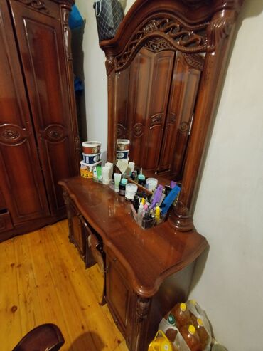 • Güzgülü makiyaj masası (tualetka) – geniş iş səthi, iri dekorativ çərçivəli güzgü, aşağı hissədə dolab və çekmecələr