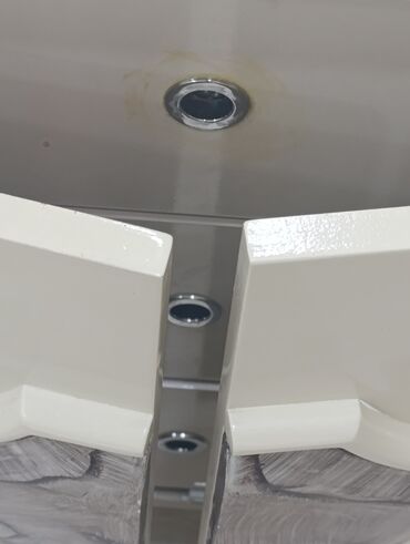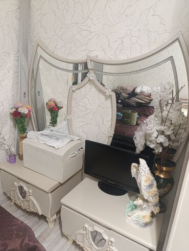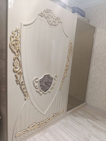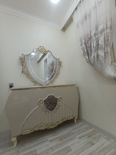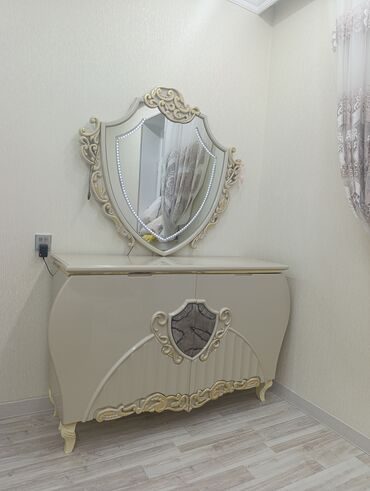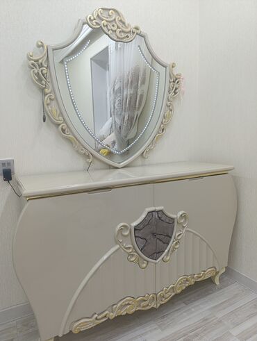 - Komod və güzgü: Eyni kolleksiyadan dekorativ naxışlı krem rəngli komod; üstündə LED işıqlı, qalxan formalı güzgü. Komodun önündə qızılı ornamentlər və dekor mərkəz elementləri.
