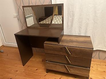 - Makiyaj/iş masası: tünd qəhvəyi masaüstü, yan tərəfdə 3 çekmecəli komod. Çekmecələrdə sarı vurğulu tutacaqlar.