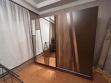 Yataq otağı mebel dəsti - Geniş sürgülü qapılı şkaf: 3 bölməli, daxili rəf və bölmələr, asılqan yerləri, alt hissədə açıq bölmələr; ön hissədə böyük güzgü paneli. - Çarpayı: yumşaq başlıqla, tax...
