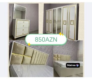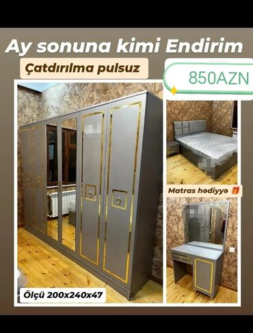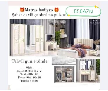 Yataq otağı dəsti – 850 AZN Komplekt: - 6 qapılı sürgülü şkaf (ölçü: 200×240×47 sm; güzgülü qapılar, bölməli iç quruluş) - Taxt (ölçü: 200×160 sm), yumşaq başlıq - güzgü (termo – ölçü: 90×180×40 s...