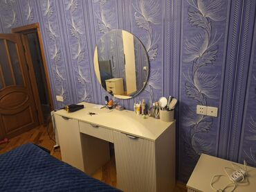 - Makiyaj/komod masa – geniş stolüstü, dairəvi asma güzgü, iki yan şkaf bölməsi və yuxarıdan açılan çekmecə tutaçları.