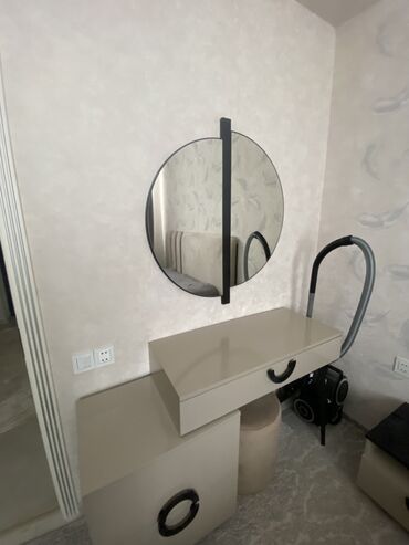 - Tualet masası: üst hissə çekmecəli konsol, yanında əlavə modullu alt blok; yumru oturacaq (puf) ilə.