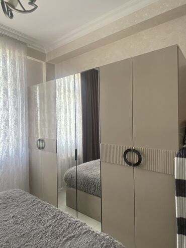 - Güzgülü paltar şkafı: 4 qapılı, mərkəzdə tam boy güzgülər; enində dekorativ relyef panellər və qara halqa tutacaqlar.