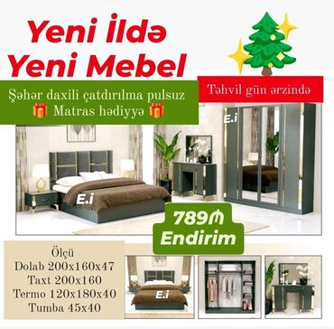 Yataq dəsti – sifarişlə hazırlanır Komplekt: - Dolab (3 qapılı, güzgülü). Ölçü: 2x1.60/47 - Taxt: 1.60 x 2 m - Termo/masalı güzgü - 2 tumbə - Baza + matras daxildir (matras hədiyyə qeyd olunur) X...