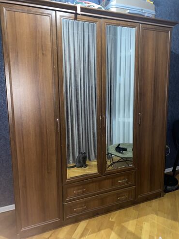 - 4 qapılı paltar şkafı – ortada 2 güzgülü qapı, aşağıda 2 geniş siyirmə. İçəridə asılqan hissəsi və rəflər üçün bölmələr.