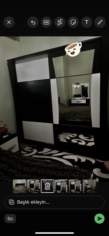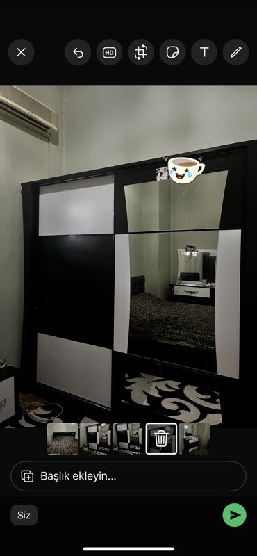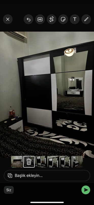 - Güzgülü paltar dolabı: sürgülü qapılar, iri mərkəzi güzgü, qara-ağ panellər, geniş saxlama imkanı.