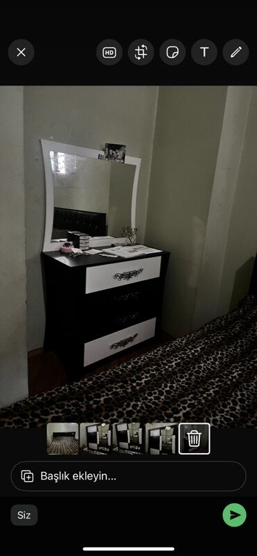 - Tualet masası/komod: 3 geniş çekmece, iri çərçivəli güzgü, dekorativ tutacaqlar, qara-ağ rəngdə.