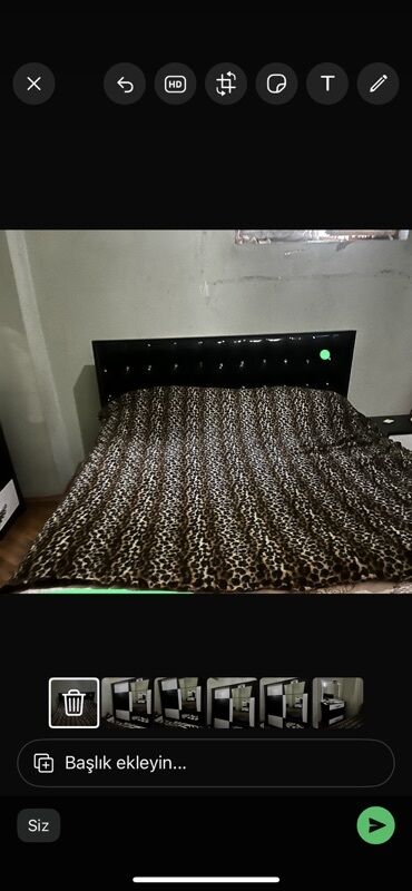 - Çarpayı: yumşaq başlıqla, düyməli dekorlu; leopard naxışlı örtü ilə göstərilib.