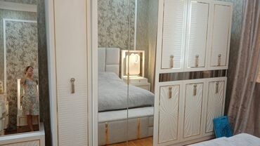 Yataq otağı dəsti Tərkibi: - 3 qapılı dolab: ortada 2 ədəd güzgülü qapı, yanlarda dekorativ qızılı xətlər; içəridə asılqan və rəf bölmələri. - Çarpayı: yastı başlıqlı, krem rəngli; uyğun ölçülü dö...