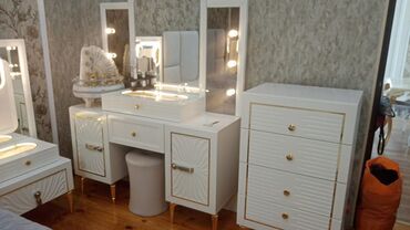 - Güzgülü tualet masası: üçlü güzgü, LED işıqlandırma, orta çekmece və iki yan dolab; oturacaq pufu ilə