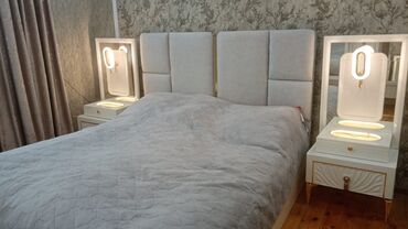 Yataq otağı dəsti – zərif qızılı detallarla Komplekt tərkibi: - Yumşaq başlıqlı, parça üzlü iri ölçülü çarpayı (ortopedik döşəklə). Kənarlarda tutacaqlar, başlıqda dik tikişli panel və güzgü-qızıl...