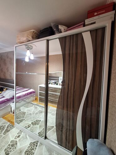 2 qapılı güzgülü kupe şkaf - Daxili sürgülü qapılar: iki ədəd tam boy güzgü paneli - Korpus: taxta/laminat tonlarında çərçivə, tavan hissəsində əlavə üst bölmə - Ölçü təxmini: hündürlük tam tavana...