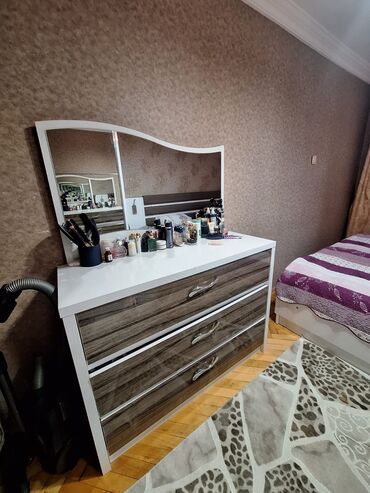 Yataq otağı və qonaq otağı üçün mebel dəsti Tərkibi: - İki nəfərlik taxta çarpayı (taxta başlıq və ayaqlıq, möhkəm karkas,) - 4 qapılı iri paltar dolabı: mərkəzdə asqılı bölmə, yanlarda rəfli his...