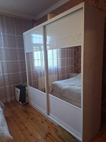 - İki sürgülü qapılı, güzgülü böyük dolab. Ağ rəng, dekorativ parıltılı panel zolaqları.
