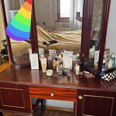 • Tualet masası – geniş iş səthi, 3 bölməli güzgü paneli (mərkəzi və iki yan güzgü), ortada çekmece, hər iki yanda qapılı bölmələr, metal düymələr