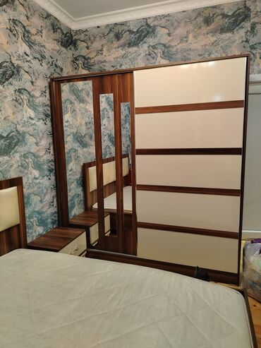 Yataq otağı mebel dəsti - Çarpayı: yumşaq süngərlə işlənmiş düyməli başlıq, neytral açıq rəngli örtüklə uyğunlaşan dizayn. İki nəfərlik ölçüdə. - Şkaf: sürgülü qapılar, bir qapıda iri boy güzgü, d...