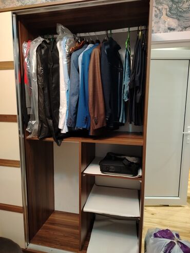 - Geniş sürgülü qapılı şkaf: ikitərəfli bölmələr, asılqan üçün uzun bölmə, alt və yan rəflər; qapıda böyük güzgü. Korpus qəhvəyi ağac teksturası, krem rəngli panellərlə kombinasiya.