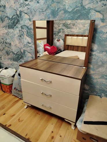 - Tualet masası/komod: 3 geniş çekmece, metal tutacaqlar, üstündə böyük güzgü; üst panel ağac teksturalı, ön panellər krem rəngində.