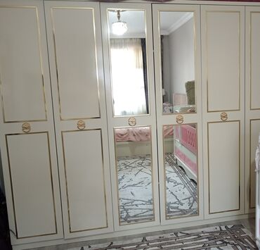 - 6 qapılı iri qarderob: krem rəngdə, qızılı haşiyələr və qızılı tutacaqlar, 2 ədəd tam ölçülü güzgü qapı, daxili geniş saxlama sahəsi üçün bölmələr/askılıq üçün nəzərdə tutulmuş quruluş.