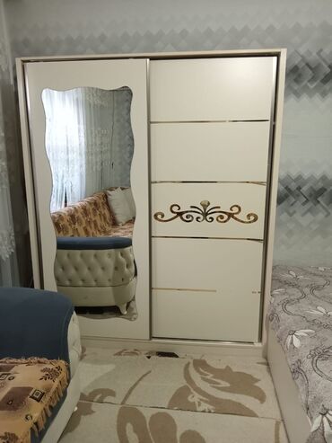 - Şkaf: sürgülü qapılı 3 bölməli konstruksiya; bir qapıda bədii formalı iri güzgü, digər qapıda qızılı ornament. Daxildə asılqan və rəf üçün geniş sahə (şəkillərdə görünür).