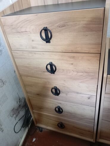 - 5 çekmeceli komod: geniş saxlamaya uyğun, eyni üslubda halqa tutacaqlar, qara üst panel.