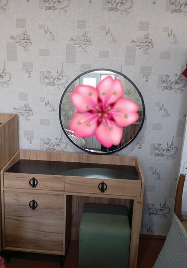 - Dairəvi güzgülü makiyaj masası: 2 üst çekmece, 1 iri yan şkaf bölməsi, qara üst səth, yan qoruyucu bortlar, metal halqa formalı tutacaqlar. Altında oturacaq üçün yer.